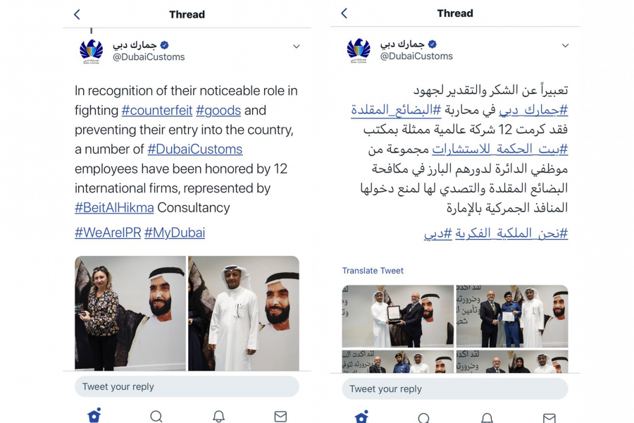 On 4 November 2019, the clients of IP Whiz - including Van Cleef & Arpels and PUMA - expressed their gratitude to Dubai Customs for its diligence and professionalism in protecting their IP rights against counterfeits. During a ceremony at Dubai Customs headquarters, trophies were presented to Yousef Ozair, Head of the Dubai Customs IP Dept, and certificates were presented to individual officers. On 9 November, Dubai Customs proudly shared this recognition with the world through its Twitter feed.