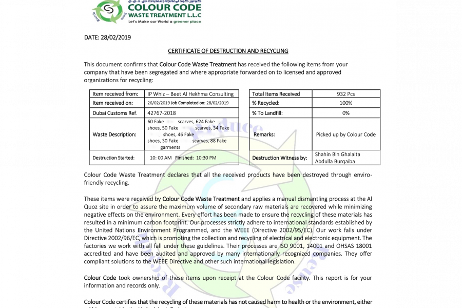 Going the extra mile, Dubai Customs is ensuring that fake goods are destroyed in a safe and environmentally friendly way - with as much of the component materials being recycled as possible. Their 'Green Destruction' certificate explains the process in detail.